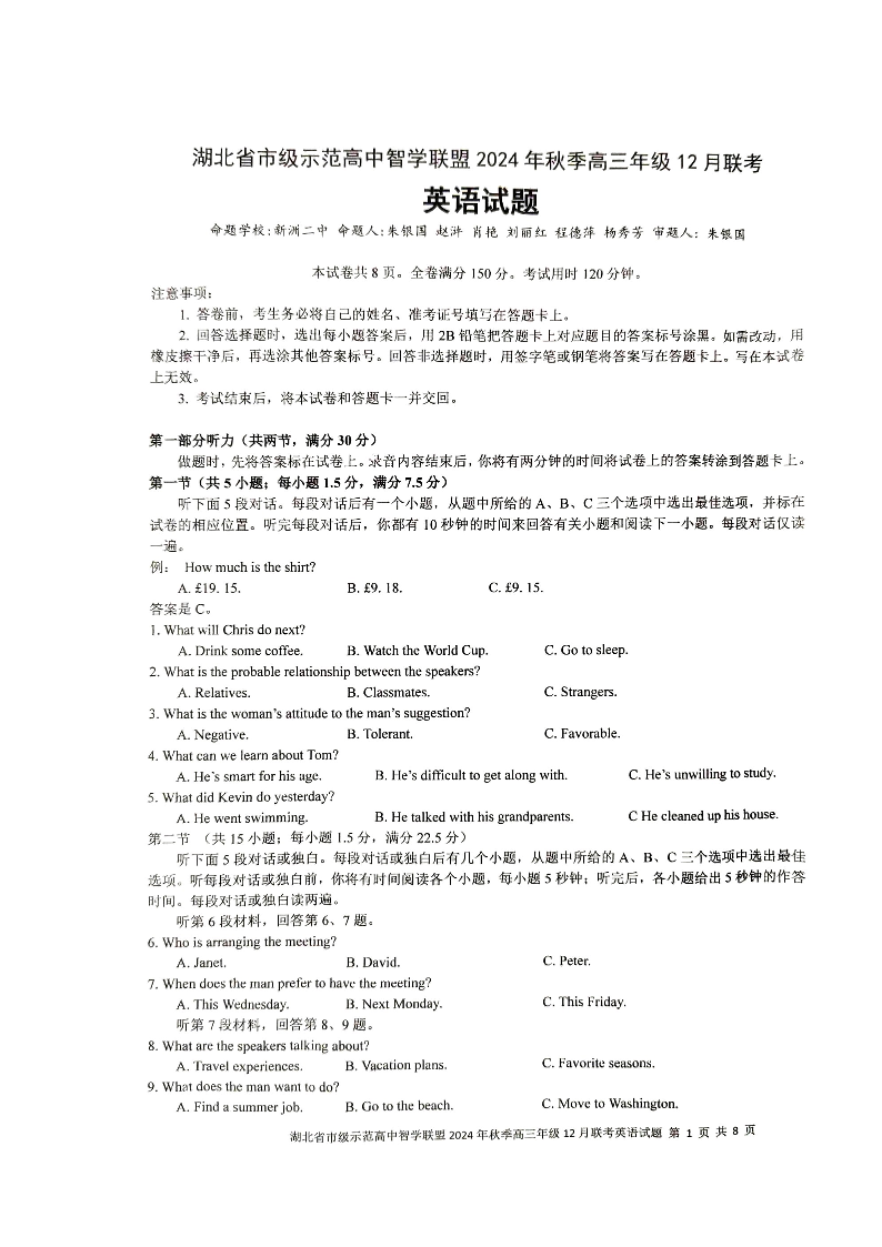 湖北省市级示范高中智学联盟2025届高三12月联考 英语