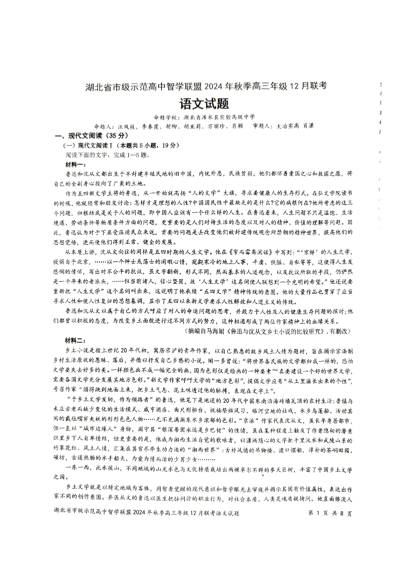 湖北省市级示范高中智学联盟2025届高三12月联考 语文