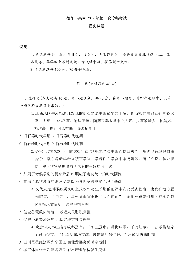 德阳市高中2022级第一次诊断考试 历史
