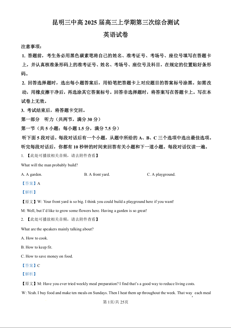 昆明三中高2025届高三上学期第三次综合测试 英语答案