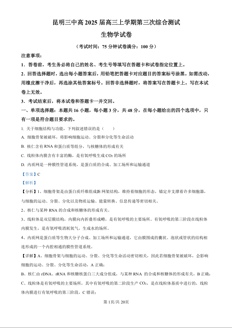 昆明三中高2025届高三上学期第三次综合测试 生物答案