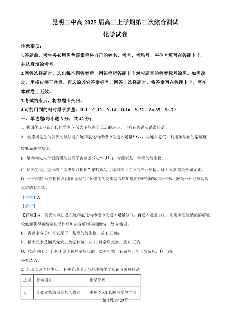 昆明三中高2025届高三上学期第三次综合测试 化学答案