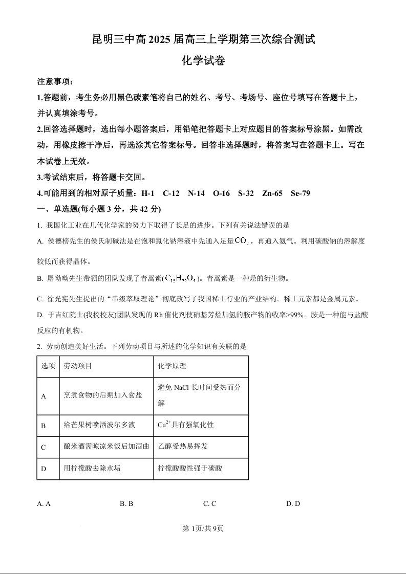 昆明三中高2025届高三上学期第三次综合测试 化学