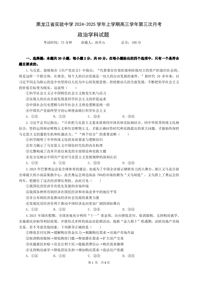 黑龙江省实验中学2024-2025学年高三上学期第三次月考 政治