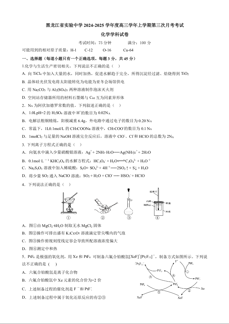 黑龙江省实验中学2024-2025学年高三上学期第三次月考 化学