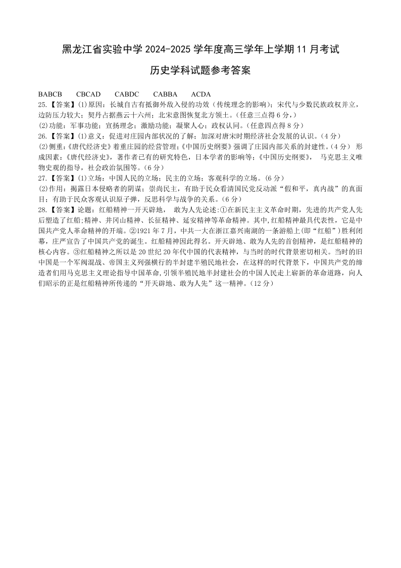 黑龙江省实验中学2024-2025学年高三上学期第三次月考 历史答案