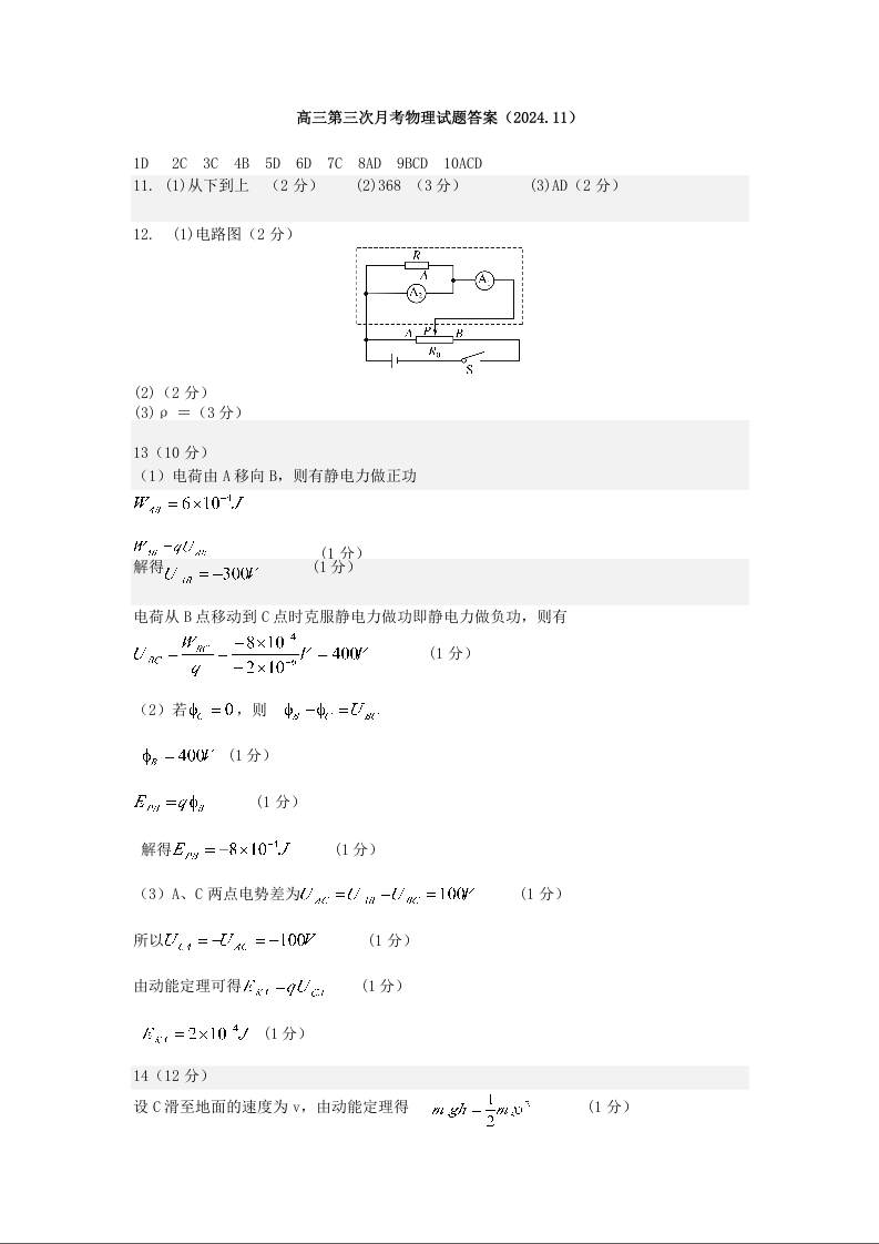 黑龙江省实验中学2024-2025学年高三上学期第三次月考 物理答案