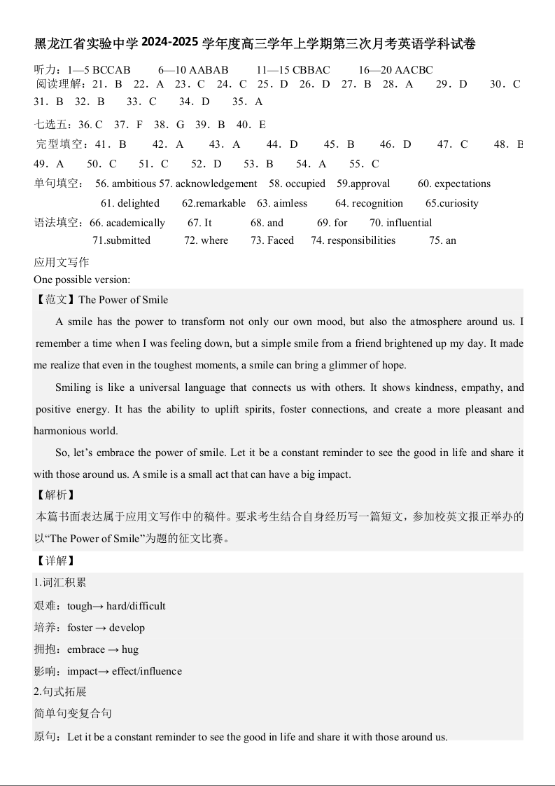 黑龙江省实验中学2024-2025学年高三上学期第三次月考 英语答案