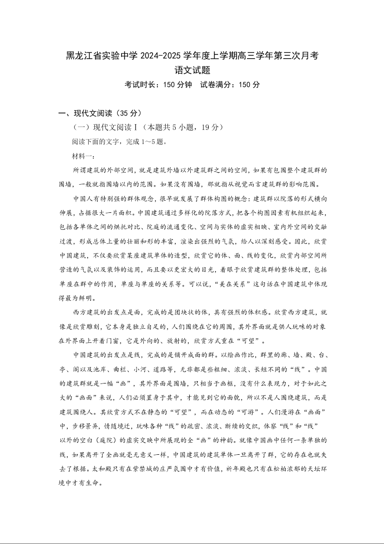 黑龙江省实验中学2024-2025学年高三上学期第三次月考 语文