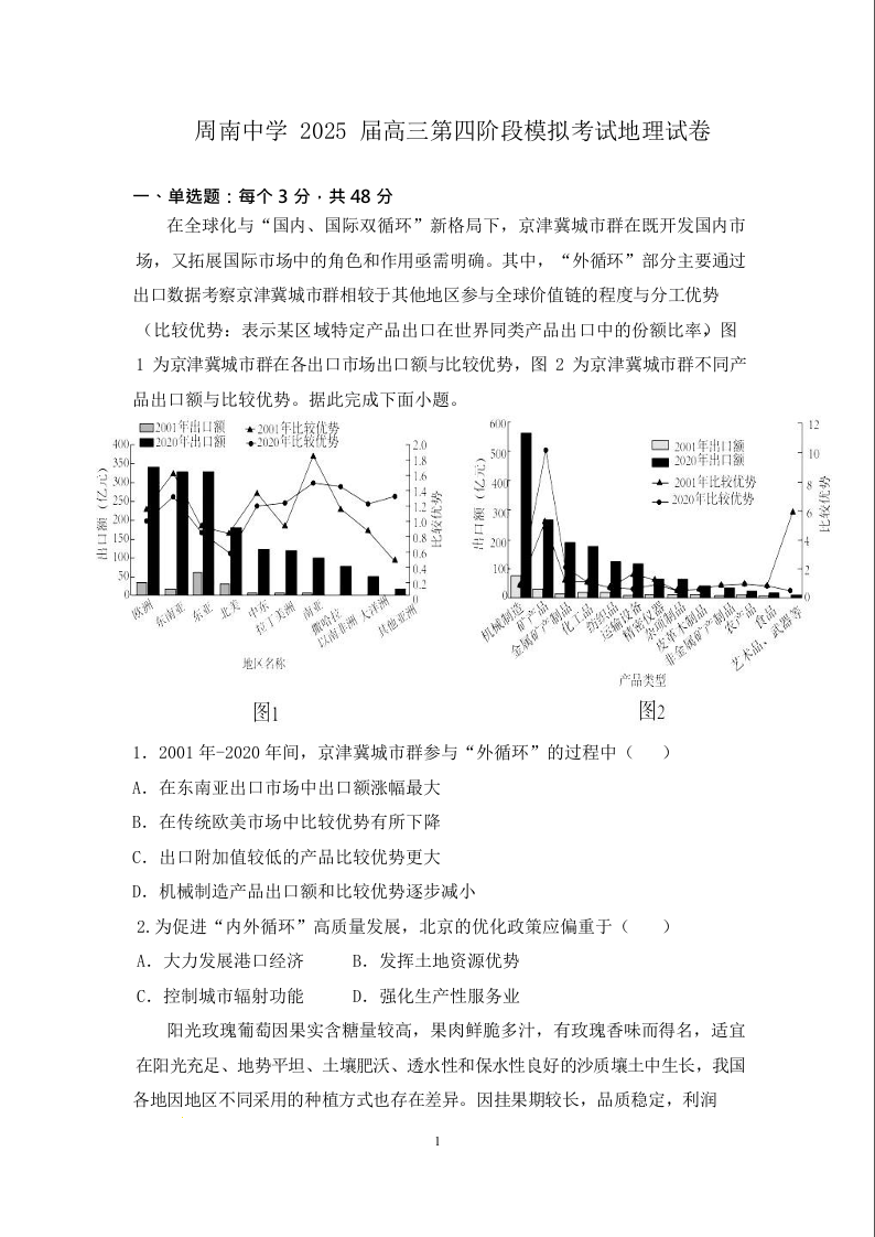 湖南省长沙市周南中学2025届高三第四阶段模拟考试 地理