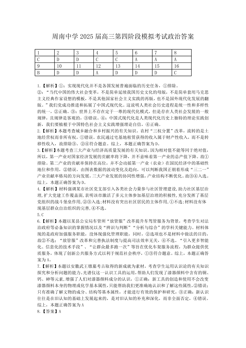 湖南省长沙市周南中学2025届高三第四阶段模拟考试 政治答案