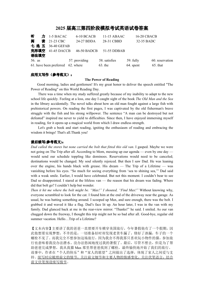 湖南省长沙市周南中学2025届高三第四阶段模拟考试 英语答案