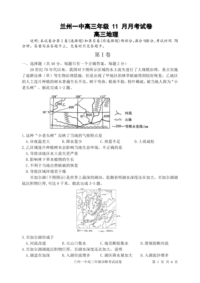 甘肃省兰州市第一中学2025届高三年级11月月考 地理
