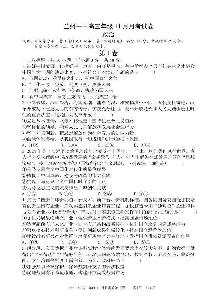 甘肃省兰州市第一中学2025届高三年级11月月考 政治