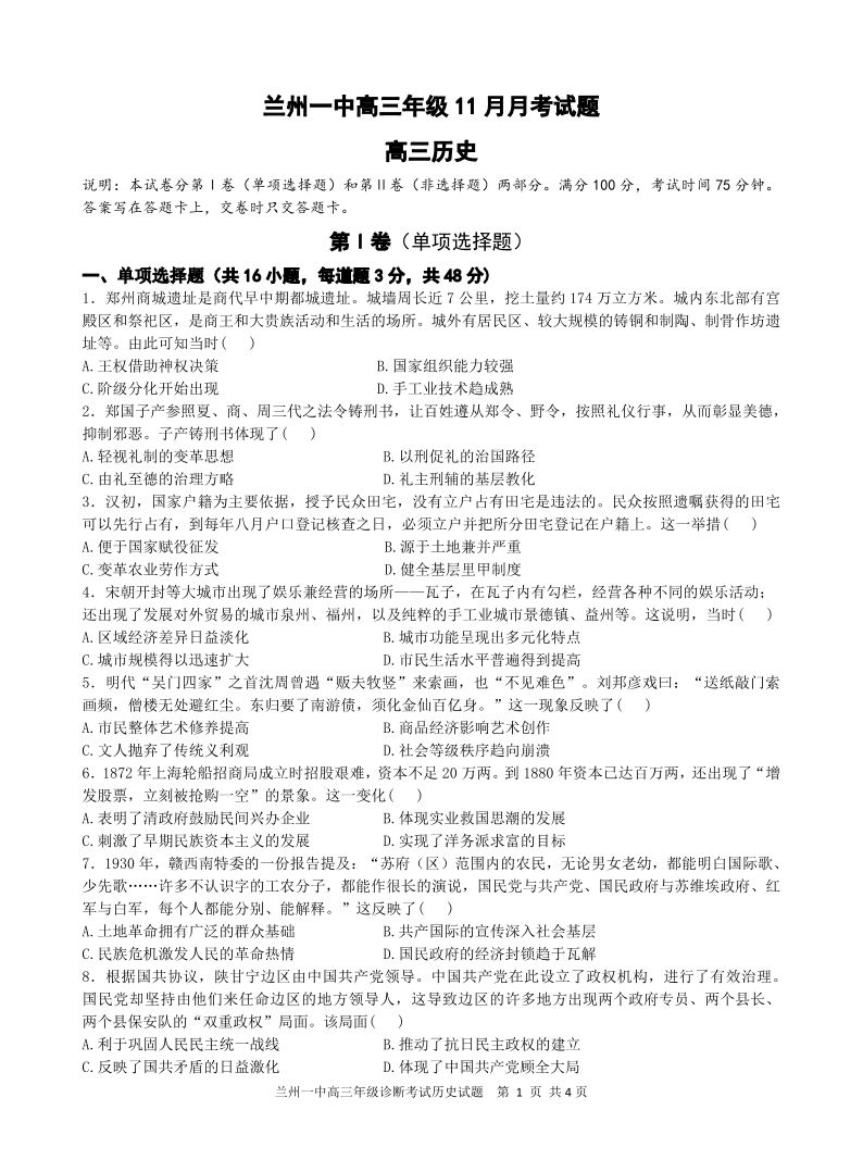 甘肃省兰州市第一中学2025届高三年级11月月考 历史