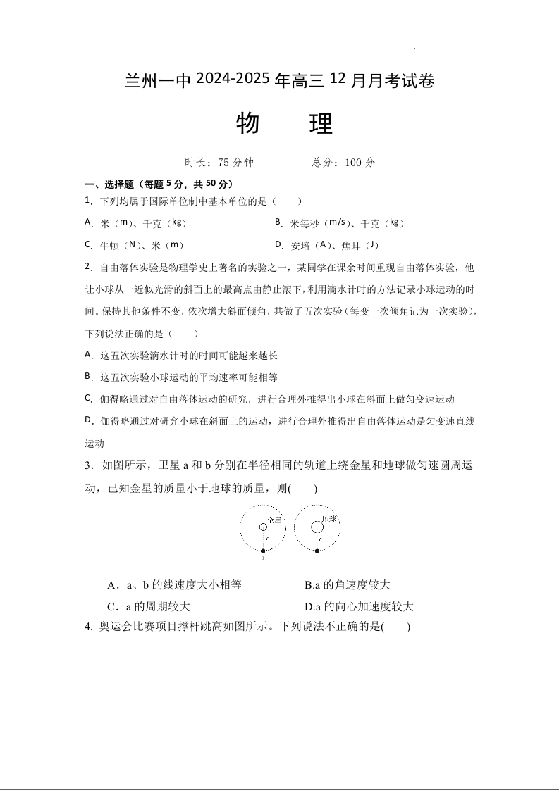 甘肃省兰州市第一中学2025届高三年级11月月考 物理