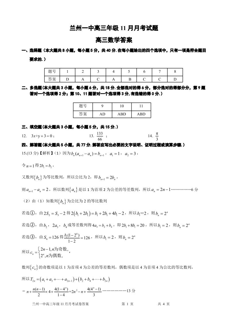 甘肃省兰州市第一中学2025届高三年级11月月考 数学答案