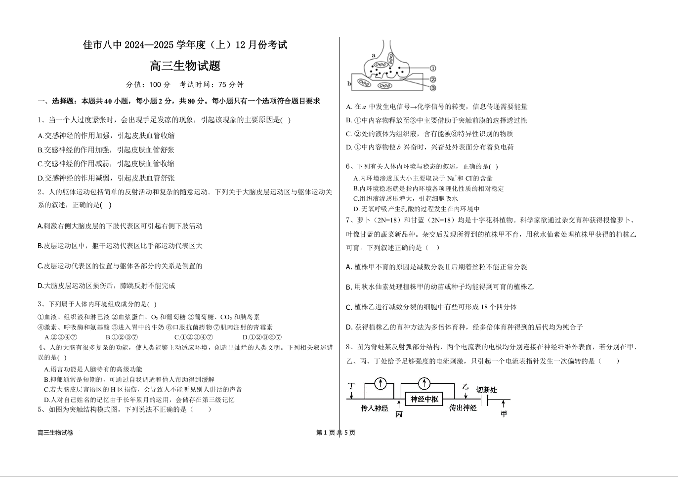 黑龙江省佳木斯市第八中学2025届高三上学期12月月考 生物