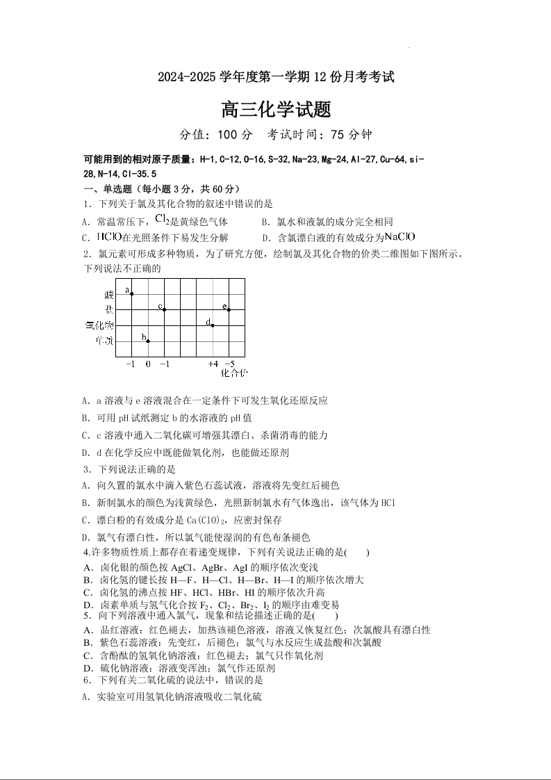 黑龙江省佳木斯市第八中学2025届高三上学期12月月考 化学