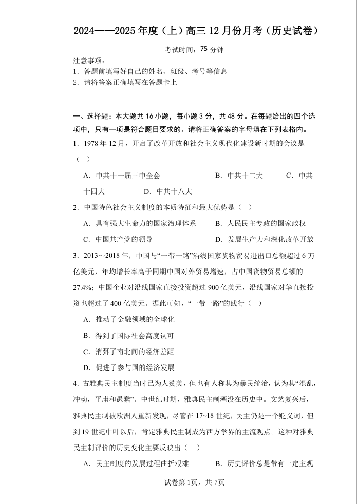 黑龙江省佳木斯市第八中学2025届高三上学期12月月考 历史