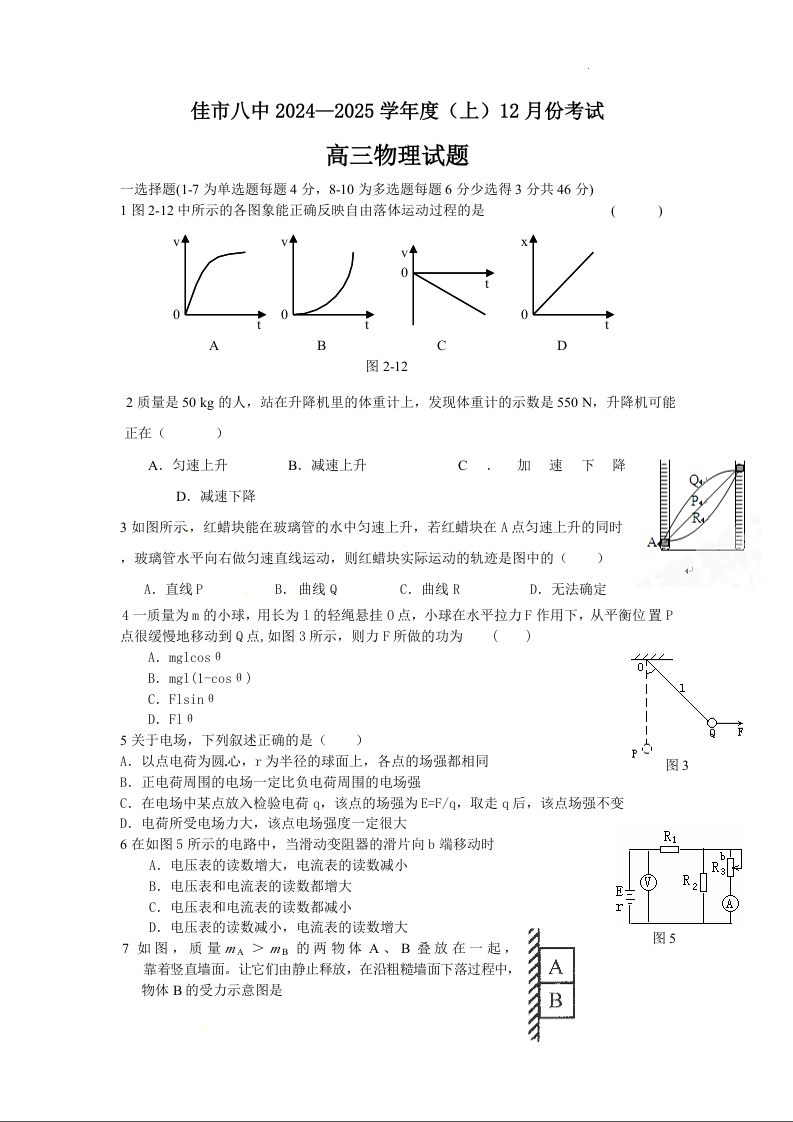 黑龙江省佳木斯市第八中学2025届高三上学期12月月考 物理