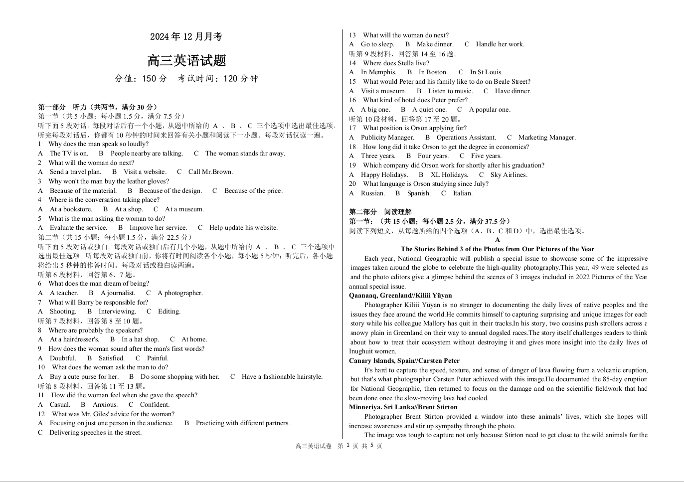 黑龙江省佳木斯市第八中学2025届高三上学期12月月考 英语