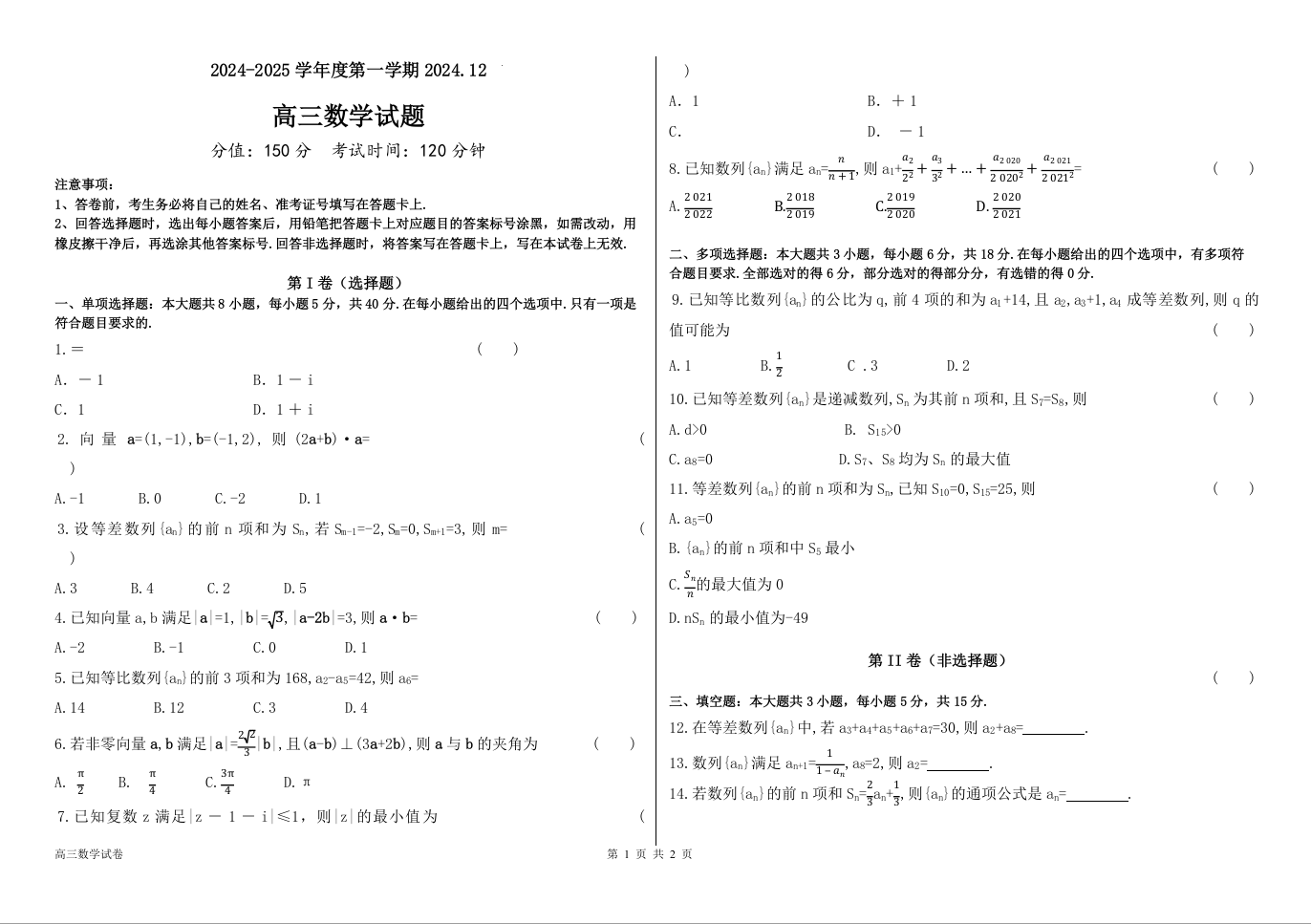 黑龙江省佳木斯市第八中学2025届高三上学期12月月考 数学