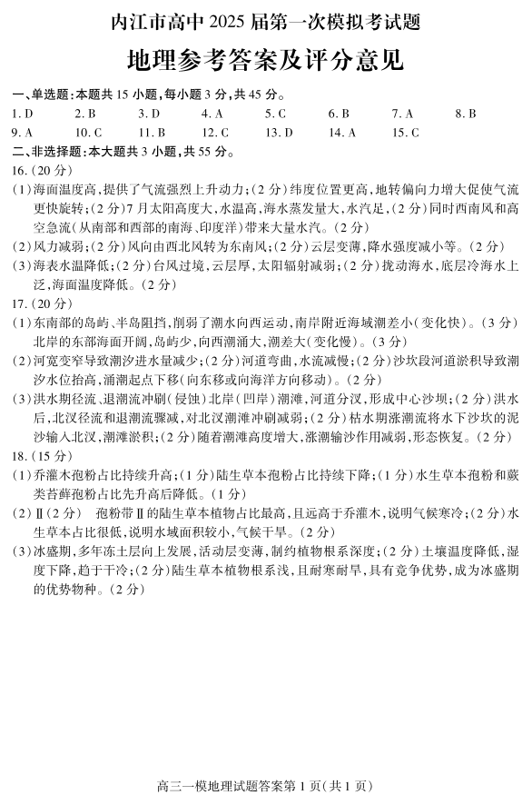 四川省内江市2025届高三上学期第一次模拟考试 地理答案