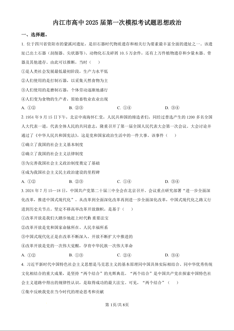 四川省内江市2025届高三上学期第一次模拟考试 政治