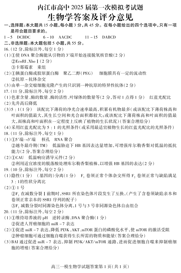 四川省内江市2025届高三上学期第一次模拟考试 生物答案