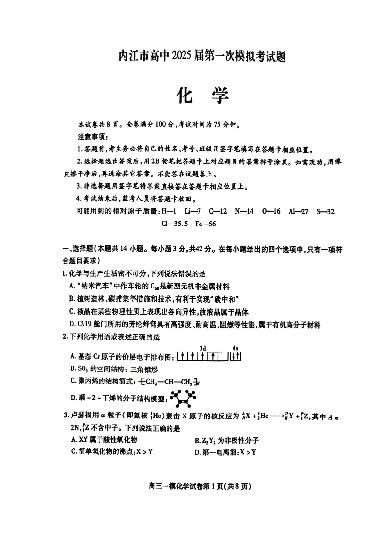 四川省内江市2025届高三上学期第一次模拟考试 化学