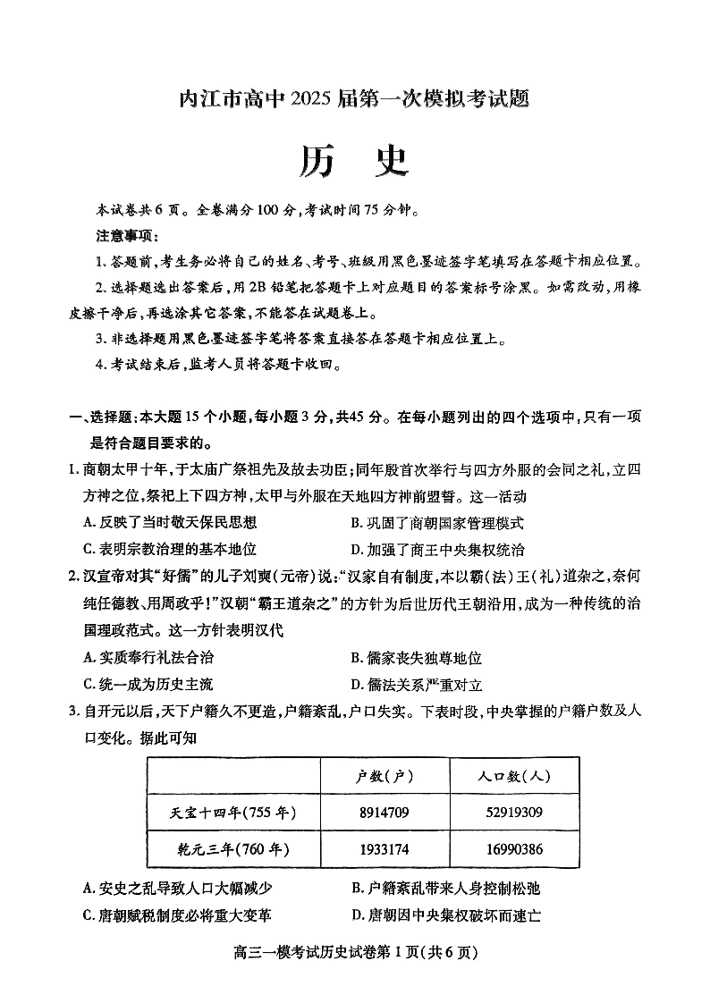 四川省内江市2025届高三上学期第一次模拟考试 历史