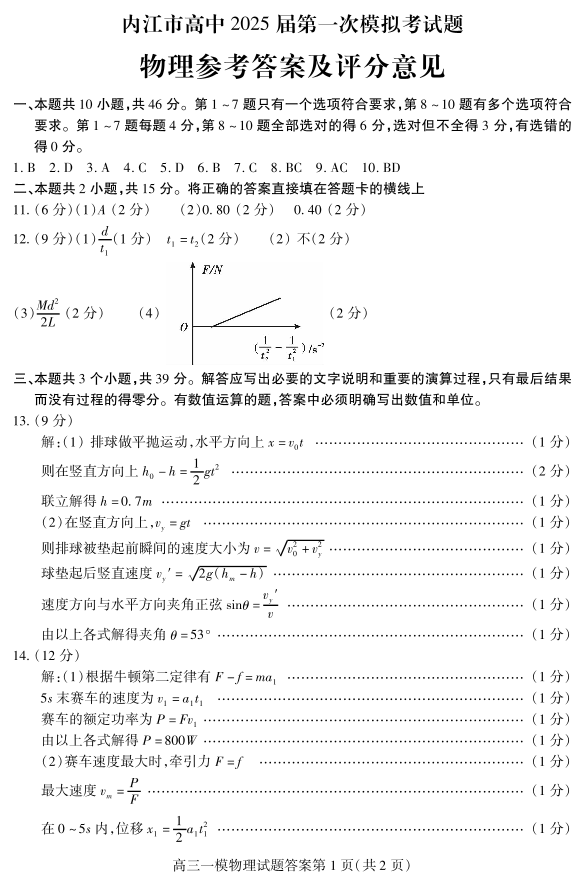 四川省内江市2025届高三上学期第一次模拟考试 物理答案
