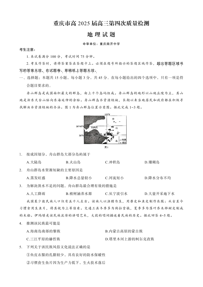 重庆市高2025 届高三第四次质量检测 地理