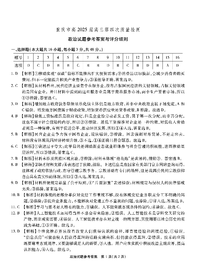 重庆市高2025 届高三第四次质量检测 政治答案
