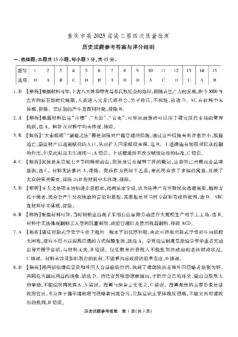 重庆市高2025 届高三第四次质量检测 历史答案
