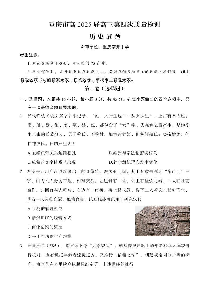 重庆市高2025 届高三第四次质量检测 历史