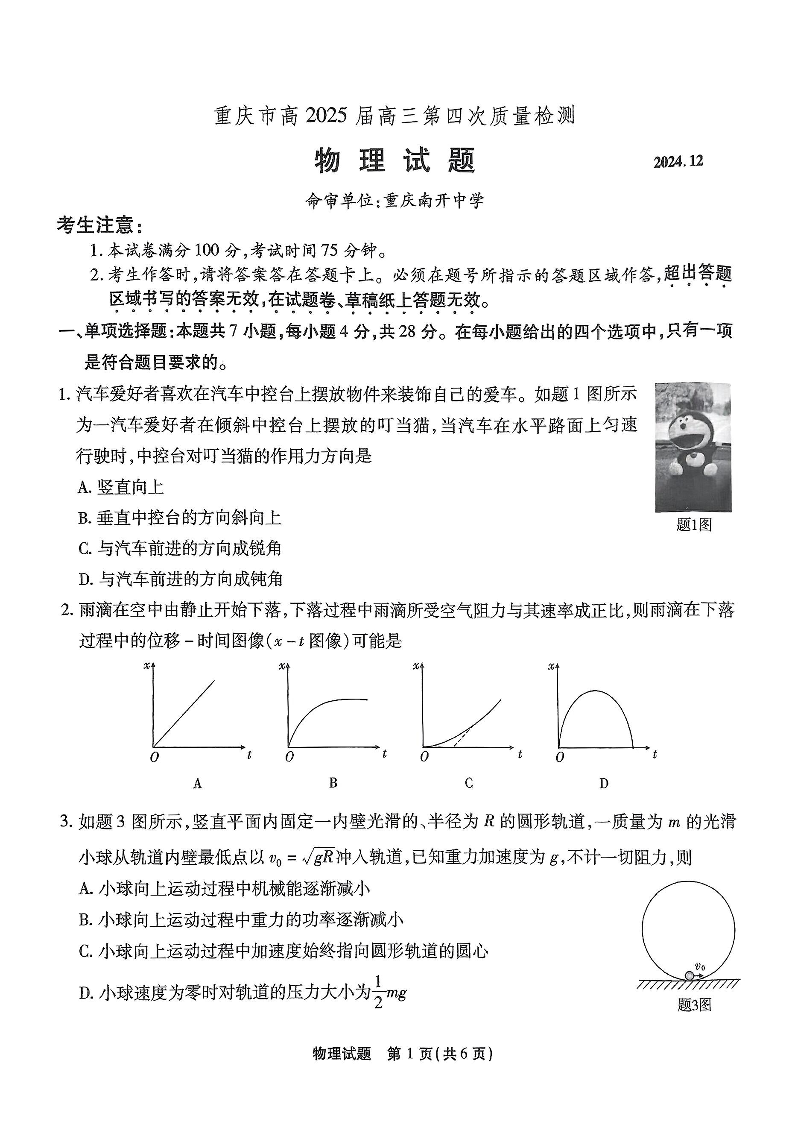 重庆市高2025 届高三第四次质量检测 物理