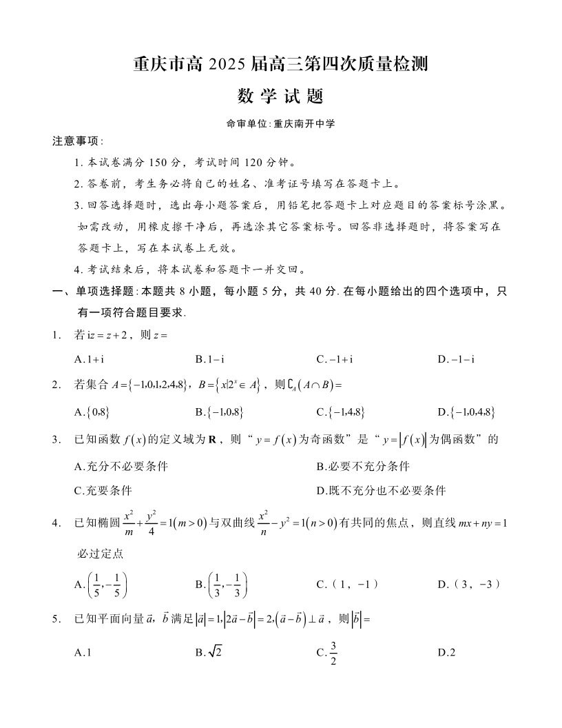 重庆市高2025 届高三第四次质量检测 数学
