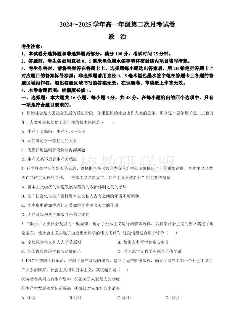 安徽省亳州市涡阳县2024-2025学年高一上学期第二次月考(期中)政治