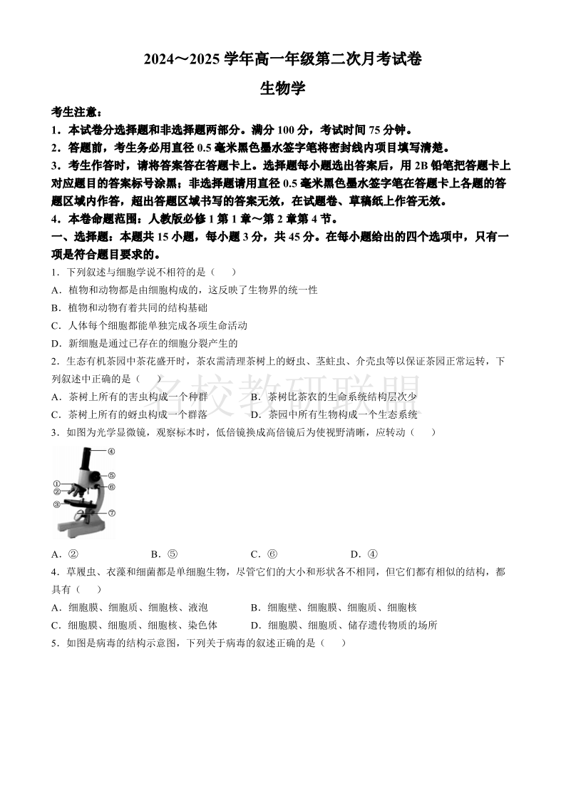 安徽省亳州市涡阳县2024-2025学年高一上学期第二次月考(期中)生物