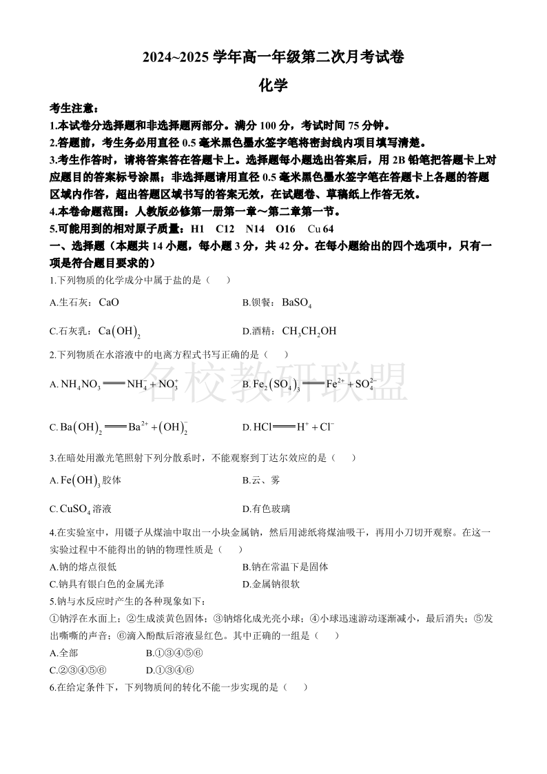 安徽省亳州市涡阳县2024-2025学年高一上学期第二次月考(期中)化学