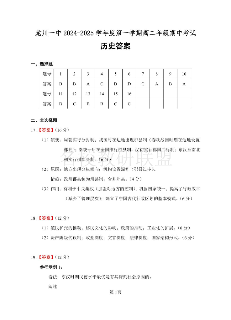 龙川一中2024-2025学年第一学期高二年级期中考试 历史答案
