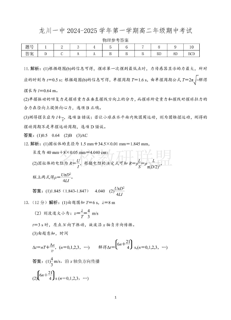 龙川一中2024-2025学年第一学期高二年级期中考试 物理答案