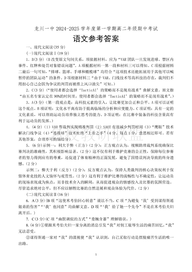 龙川一中2024-2025学年第一学期高二年级期中考试 语文答案