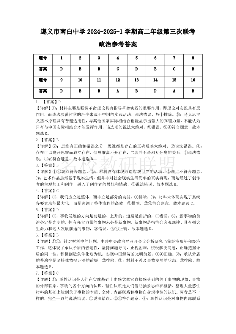 贵州省名校协作体2024-2025学年高二上学期联考(一)政治答案
