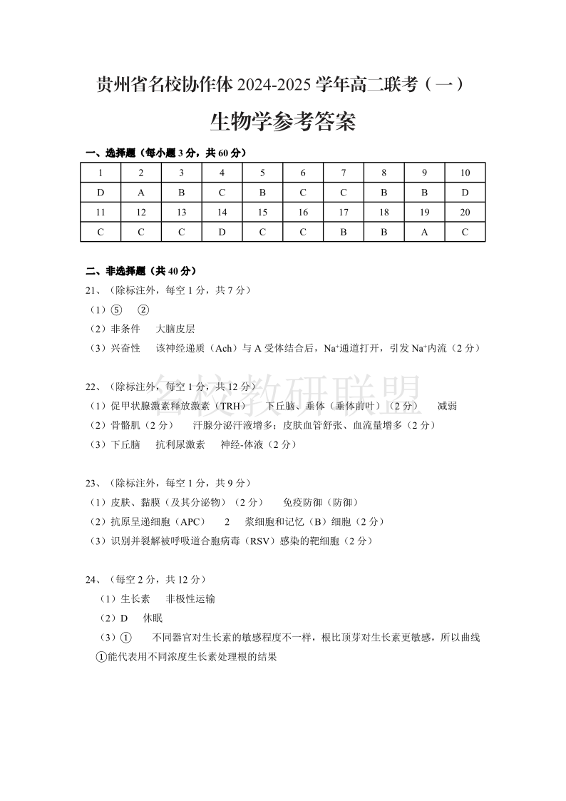 贵州省名校协作体2024-2025学年高二上学期联考(一)生物答案