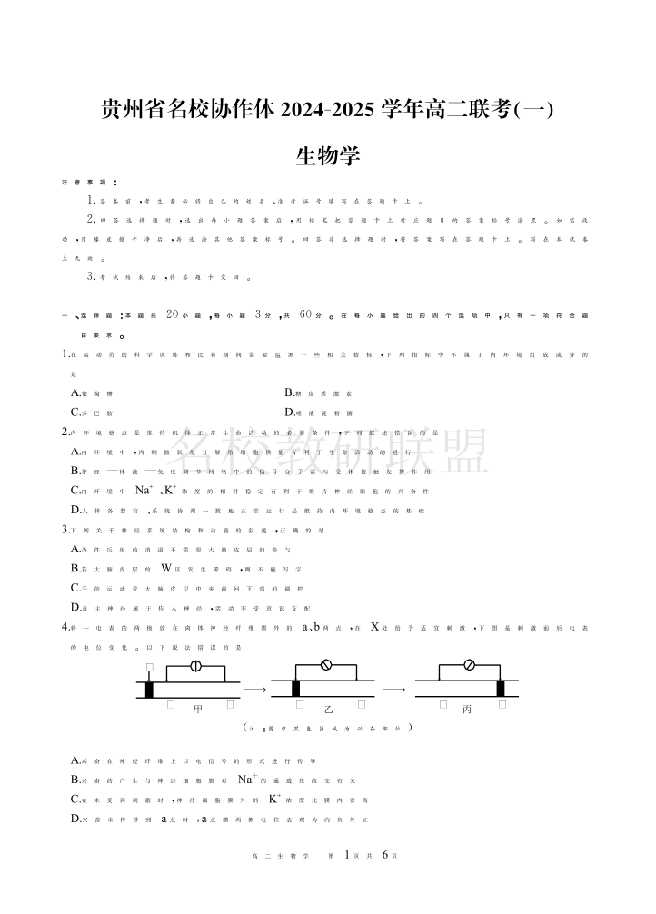贵州省名校协作体2024-2025学年高二上学期联考(一)生物