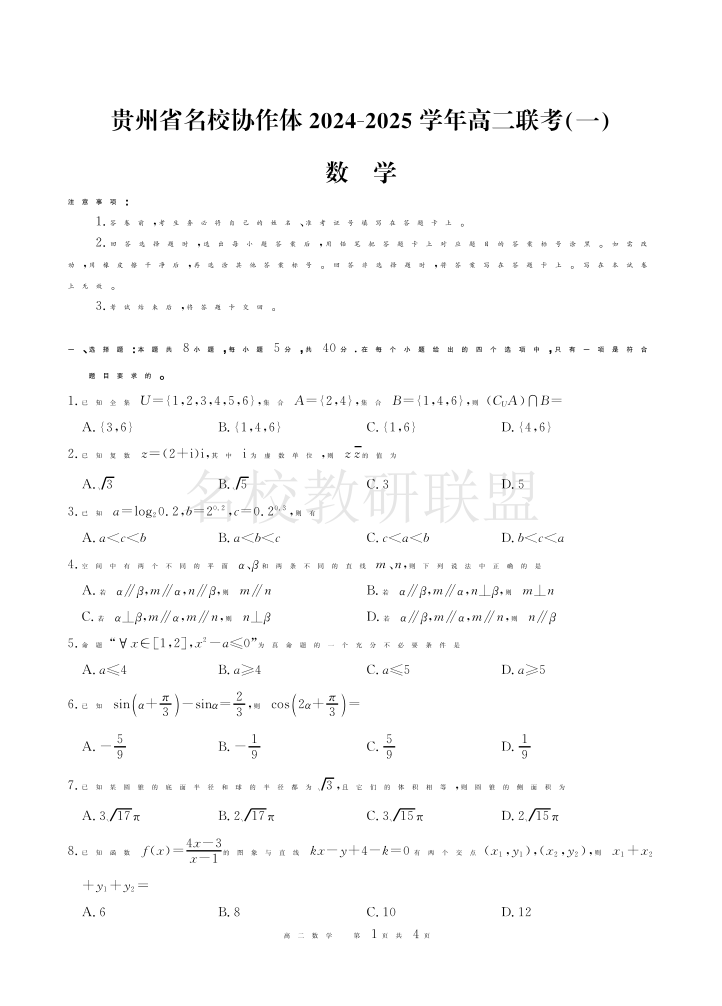 贵州省名校协作体2024-2025学年高二上学期联考(一)数学