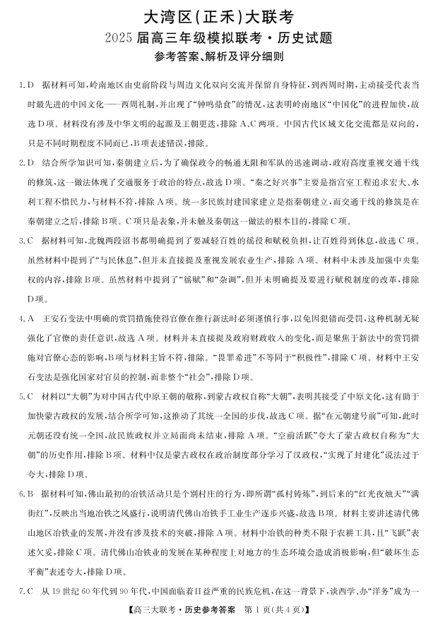 2025届广东省大湾区(正禾)大联考高三上学期模拟联考 历史答案